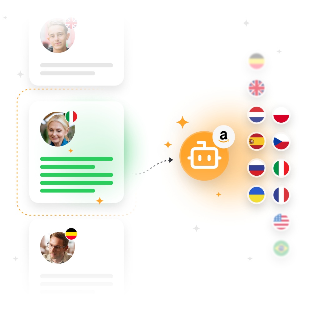 Amazon Marketplace opère à l’échelle mondiale, ce qui signifie que des clients du monde entier peuvent acheter dans votre boutique. Avec Responso, vous gérez tous vos comptes Amazon internationaux dans une boîte de réception organisée. Utilisez des dossiers et des étiquettes pour structurer les conversations et aligner votre équipe. Les outils propulsés par l’IA détectent automatiquement la langue des messages entrants, les traduisent instantanément et vous aident à répondre dans la langue maternelle du client. Les répondeurs automatiques intelligents assurent une communication rapide et précise, quel que soit le marché.