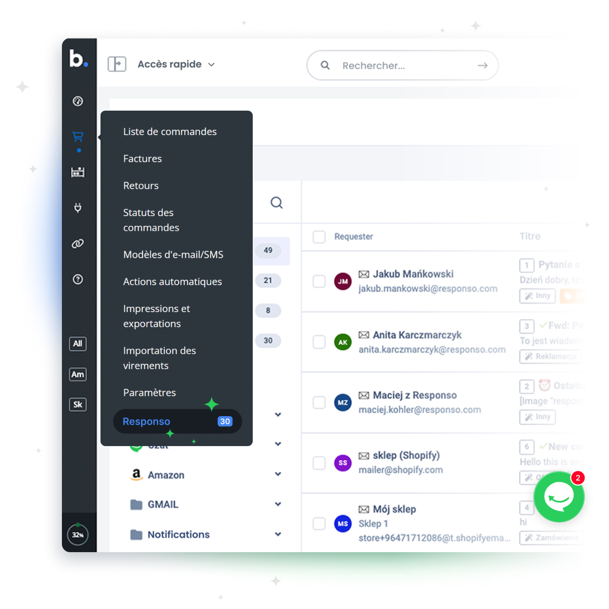 Une gestion efficace des ventes est essentielle. Mais c’est la qualité du service client qui détermine si vos acheteurs reviennent. Avec Responso, vous bénéficiez d’un centre de communication centralisé, entièrement intégré à votre interface Base. Pilotez l’ensemble de votre activité e‑commerce depuis un seul endroit — sans complexité ni désorganisation.