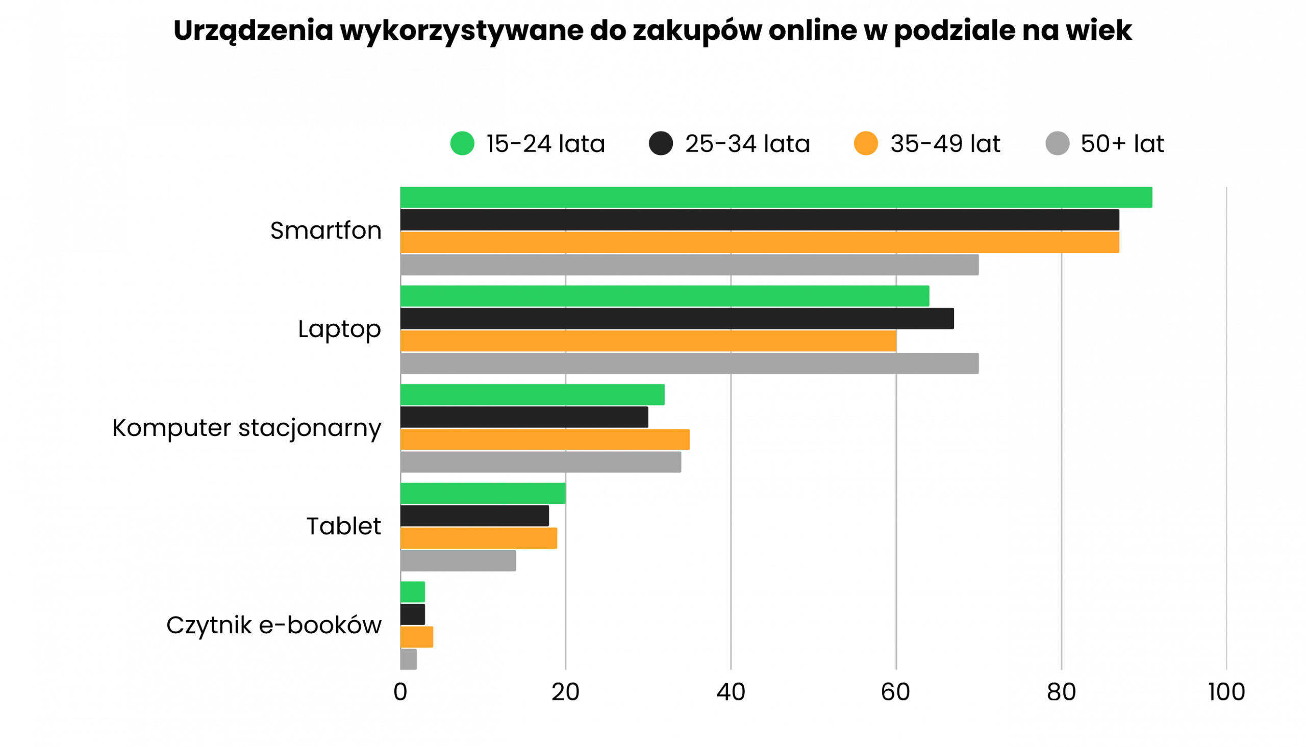 Najważniejszym technologicznym wnioskiem płynącym z raportu jest dominacja smartfona w procesie zakupowym. Aż 82% Polaków wykorzystuje telefon do robienia zakupów, a w najmłodszej grupie wiekowej (15-24 lata) odsetek ten sięga 91%. Drugi w kolejności laptop ma aż o 17 punktów procentowych mniej wskazań. Oznacza to, że każdy sklep e-commerce, który nie wdrożył podejścia mobile-first w projektowaniu ścieżki zakupowej, może tracić znaczną część potencjalnych klientów.