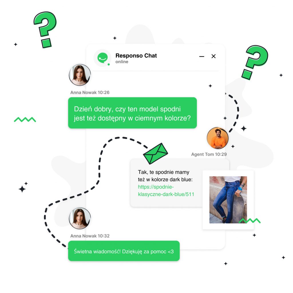 Zwieńczeniem naszych wysiłków w 2024 roku było oddanie do użytku w grudniu czatu online. To duża rzecz, na którą czekało wielu użytkowników. Czat możesz osadzić na stronie swojego e-sklepu, a wiadomości pisane przez klientów będą trafiać do Twojego inboxu Responso. Tam możesz nimi zarządzać, również przy użyciu automatycznych akcji czy funkcji AI. To jeszcze lepsza i szybsza forma komunikacji z kupującymi. Zachęcamy do wypróbowania!