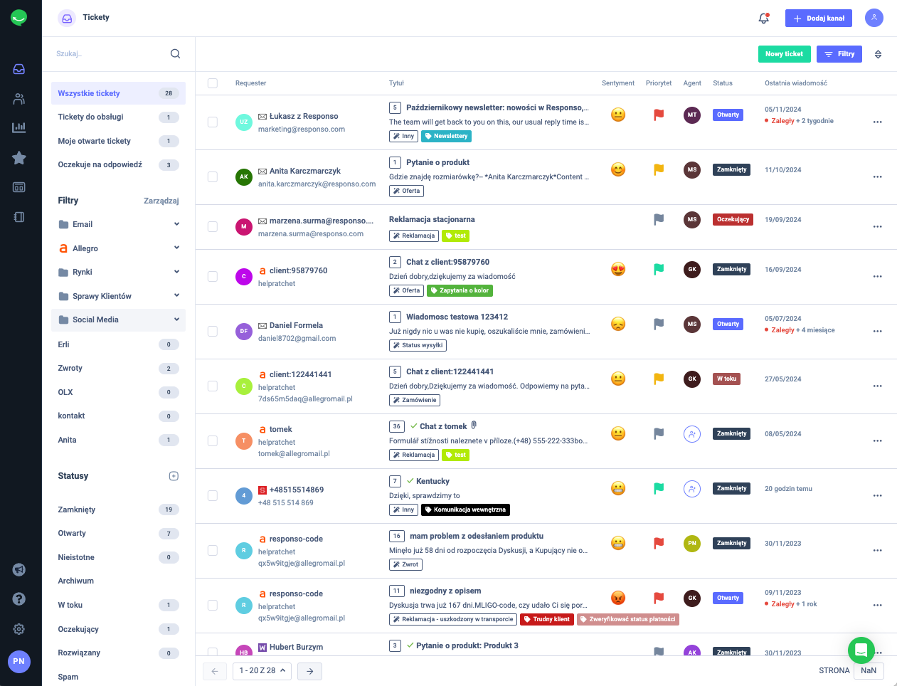 Komunikacja wielokanałowa z klientami nie jest łatwa, dlatego w sierpniu w Responso pojawił się moduł kontaktów, który umożliwia prowadzenie swego rodzaju książki teleadresowej, w której możesz zapisywać dane o klientach i ich kontach z różnych platform. Dostęp do nich masz z poziomu ticketu, więc w trakcie konwersacji możesz szybko sprawdzić, czy dany kupujący kontaktował się też za pośrednictwem innych platform. To także dobre miejsce na dodanie ogólnej notatki o kliencie.