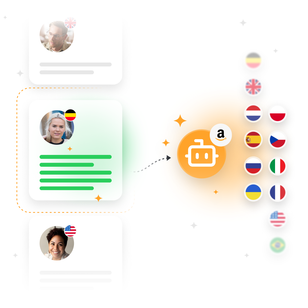 A Amazon opera globalmente, o que significa que clientes do mundo todo podem comprar na sua loja. Com o Responso, você gerencia todas as suas contas internacionais da Amazon em uma caixa de entrada organizada. Use pastas e tags para estruturar as conversas e alinhar seu time. Nossas ferramentas de IA detectam automaticamente o idioma das mensagens que chegam, traduzem na hora e ajudam você a responder no idioma nativo do cliente. Os respondedores automáticos inteligentes garantem uma comunicação rápida e precisa ‑ não importa o mercado.